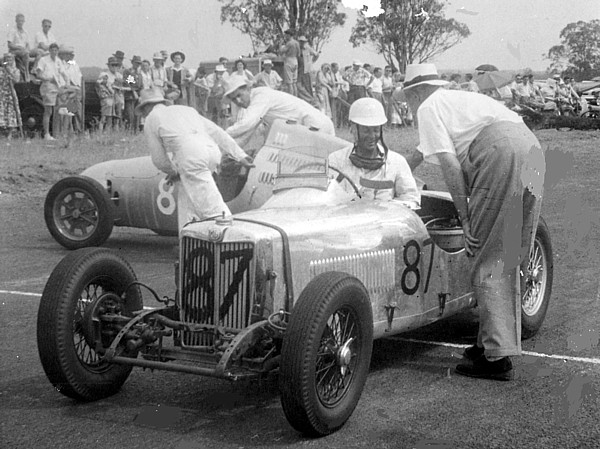 Doug Chivas MG Special # 87 and a young Jack Brabham in the background pushing his # 8 Cooper HRD on to the starting grid.